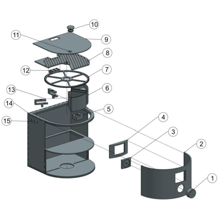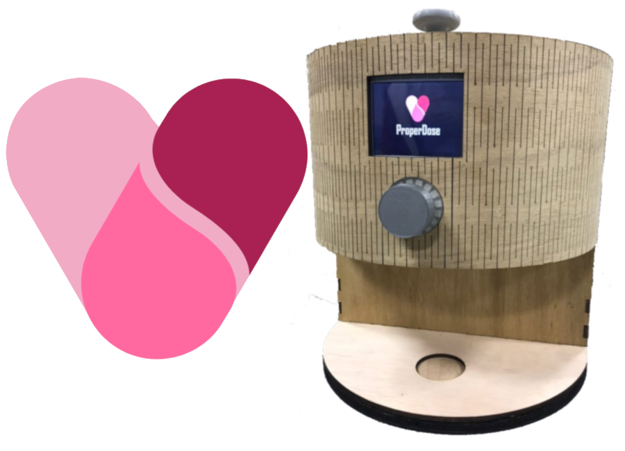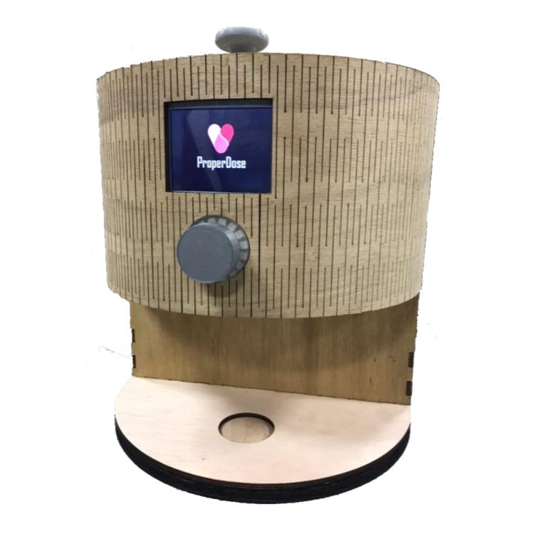 It was decided early on that the outer shell would be fabricated on a Laser Cutter out of plywood due to the high speed and accuracy. This, I achieved by redesigning the preliminary drawings to be a compatible outer shape for laser cutting, leaving most of the corners at 90 degrees and leaving just one section in the front curved to accomodate a "living hinge" laser cut design. Many of the internals were laser cut and glued in a stacked arrangement to reduce fabrication time due to the short project timeframe. After deciding on a Raspberry Pi for the platform of the ProperDose, I was tasked with providing a user interface as well as wiring the necessary electronics. The library WiringPi was used to control the GPIO pins. The user interface was split into two sections: a configuration page on a web server accessible from anywhere on any device, and a basic information-serving interface on the ProperDose's LCD.