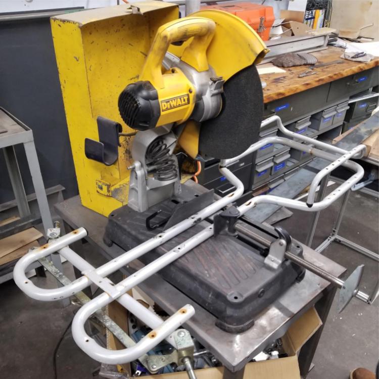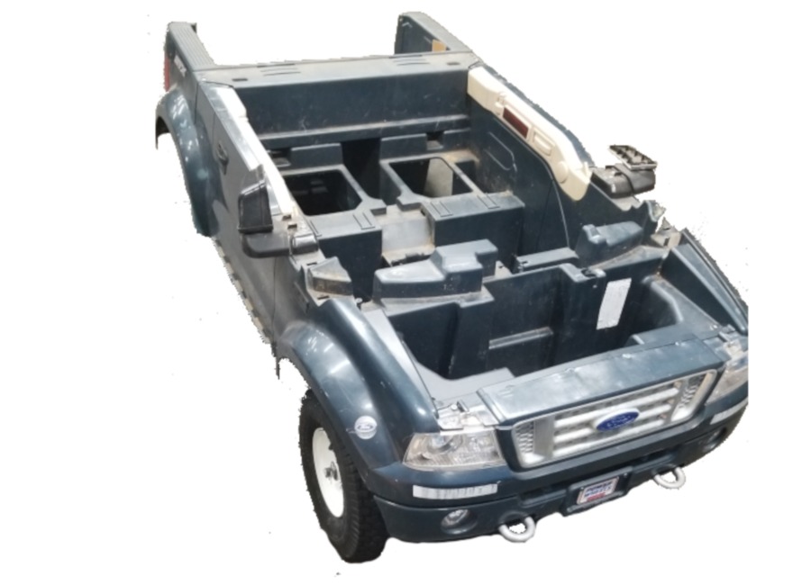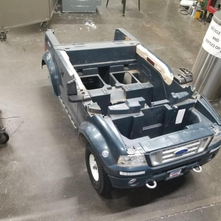 It started with the body of a Ford F-150 (a scale childrens toy version) bought off craigslist in Albany. From there, the steel frame of a pedal-powered go-kart from my childhood was used. Many steel reinforcements were added to the frame to make it withstand both our "larger than child-sized" stature and the heavy motors and electronics needed to accelerate the vehicle. Body was adapted to fit the frame and the many features of both (such as the steering rack) were reinforced.